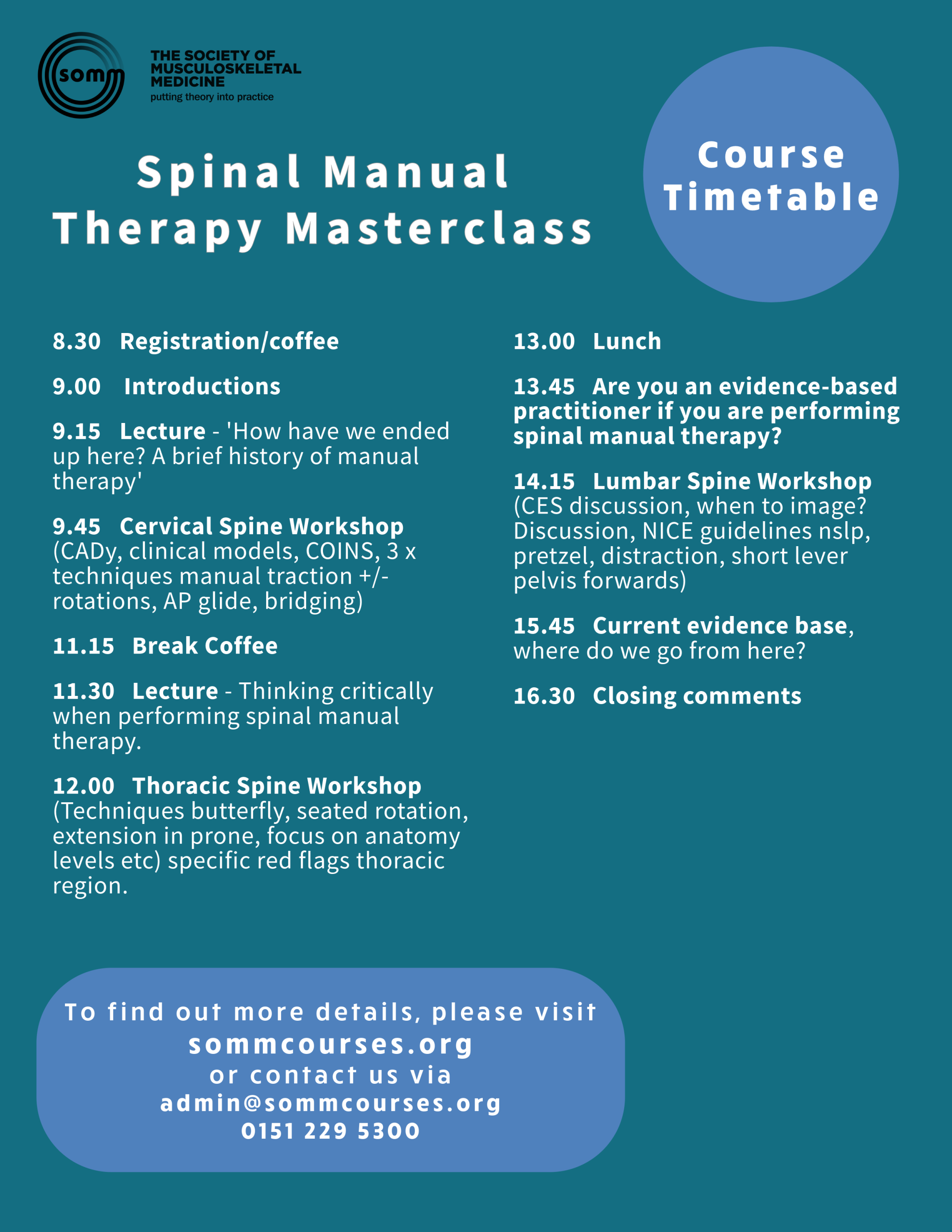 The course is multi-professional, and you will learn in a welcoming relaxed environment, guided by experienced SOMM tutors. The day will be highly interactive and there will be ample opportunities to discuss how the new treatment techniques could be integrated into your day-to-day clinical practice.